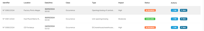 The generated event will appear on the main page indicating the Identifier number, locality of the occurrence, date/time, event class, type, impact, and its status.