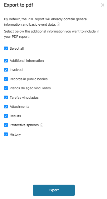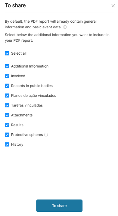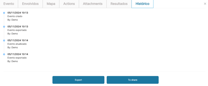 When you click on the event, you will have access to all the information recorded in it. Additionally, you can view the event history, which details the shares, edits, and exports made, as well as the users responsible for these actions. Please note: