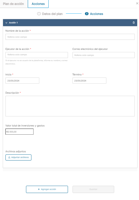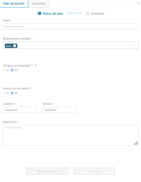4. Para crear acciones para el plan de acción, haz clic en +Agregar acción.