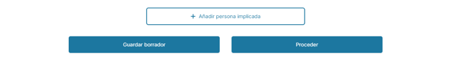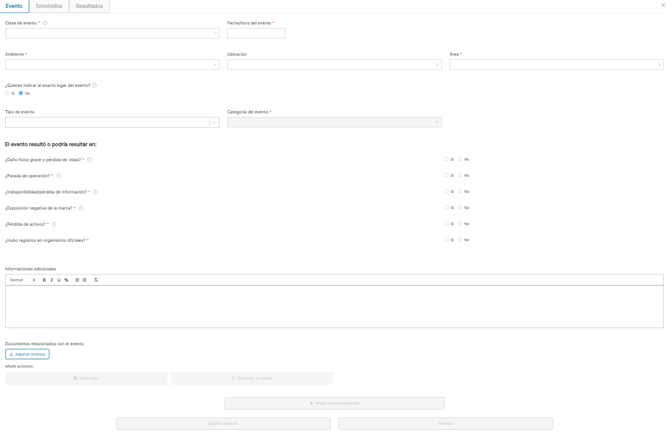 Después de completar la información en la página inicial de eventos, elige entre proceder, añadir persona implicada o guardar como borrador para completar más tarde.