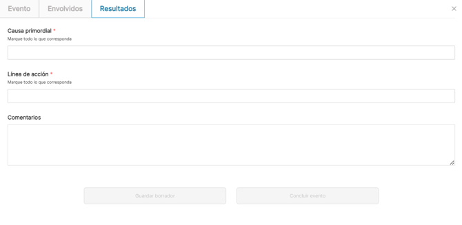 8. En la última página, identificarás la causa primordial y la línea de acción del evento creado. Si es necesario, añade comentarios.