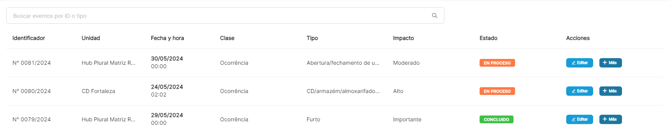 El evento generado aparecerá en la página principal mostrando el número identificador, la unidad del incidente, la fecha/hora, la clase del evento, el tipo, el impacto y su estado.
