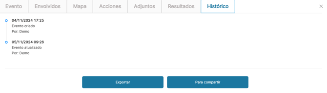 Al hacer clic en el evento, tendrás acceso a toda la información registrada en él. Además, podrás ver el histórico del evento, que detalla los compartimientos, ediciones y exportaciones realizadas, así como los usuarios responsables de esas acciones. Por favor, ten en cuenta: