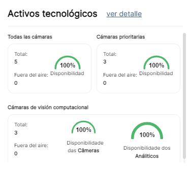 En tu tablero, verás el estado del parque tecnológico. En él, hay un resumen de la situación de todas las cámaras registradas en la plataforma, si están ON u OFF, y si las cámaras con alertas de visión computacional están funcionando normalmente.