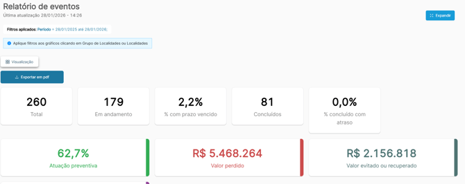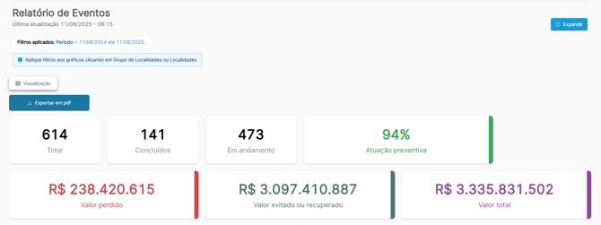 Ao gerar um relatório, você terá uma ampla visão do tema, separada por cards e gráficos para descomplicar análises e apresentações.