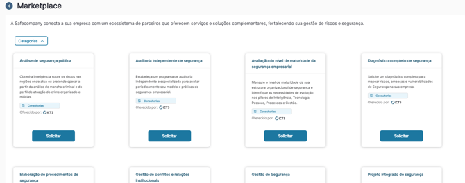 O Marketplace é uma funcionalidade que permite acessar, de forma simples, uma lista de serviços adicionais oferecidos pelos parceiros SafeCompany. Com ele, você pode contratar ou consultar os serviços que melhor atendam às suas necessidades de segurança e gestão.