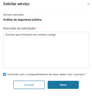 3. Preencha a descrição da sua solicitação, concorde com o compartilhamento dos seus dados de contato (nome, e-mail e telefone do usuário cadastrado) e clique em salvar