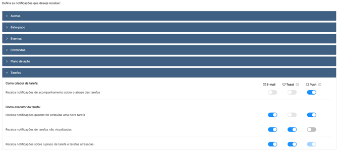 5. Selecione a(s) funcionalidade(s) que deseja configurar as notificações