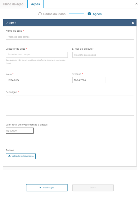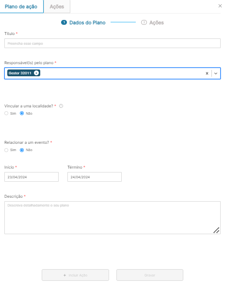 4. Para criar ações, para o plano de ação, clique em + incluir ação.