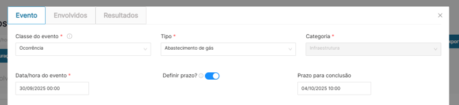 1. Ao criar um evento você terá a opção de definir um prazo para sua conclusão acionando o botão 'Definir prazo?' e preenchando o campo de data e hora.