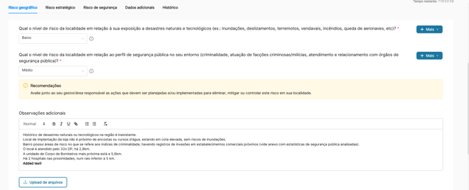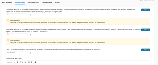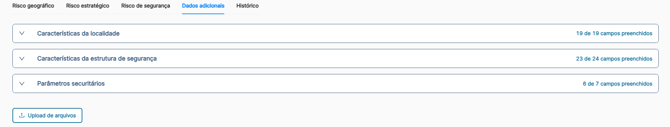 11. Nos dados adicionais, aba que fica ao lado do Risco de Segurança, você poderá trazer as informações sobre características da Localidade, como dimensões, fluxo de pessoas/veículos e acessos; sobre características de segurança, com equipe e tecnologia e seus parâmetros secutirários, como os valores em risco da Localidade