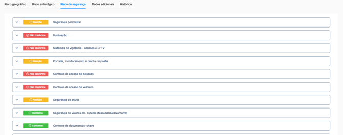 Risco de Segurança: O Risco do Sistema Integrado de Segurança mede a maturidade dos componentes de segurança por meio de um questionário. As respostas do usuário determinam o nível de conformidade e, ao final, o risco é calculado com base no percentual de atingimento da pontuação máxima.