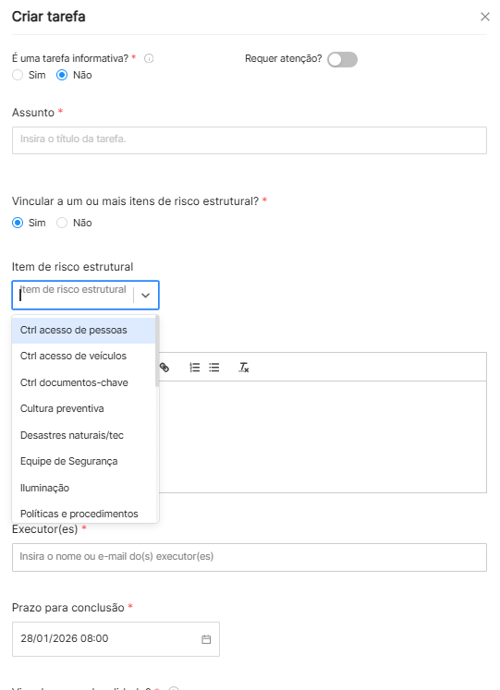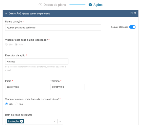 20. No preenchimento da ação você verá a pergunta 'Vincular a um ou mais itens de risco estrutural?', clique em sim e adicione os itens