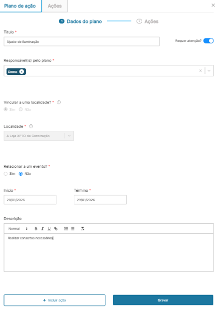 19. Preencha todas as informações do seu plano de ação e clique em incluir ação