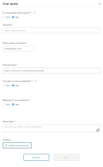 4. Para criar uma tarefa para indivíduos que não são usuários da plataforma você deve digitar o e-mail do mesmo no campo Executor(es)